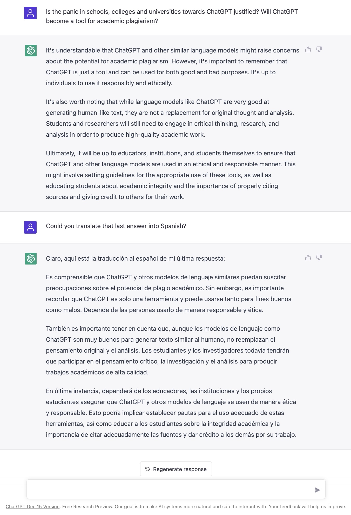 Es comprensible que ChatGPT y otros modelos de lenguaje similares puedan suscitar preocupaciones sobre el potencial de plagio académico. Sin embargo, es importante recordar que ChatGPT es solo una herramienta y puede usarse tanto para fines buenos como malos. Depende de las personas usarlo de manera responsable y ética.