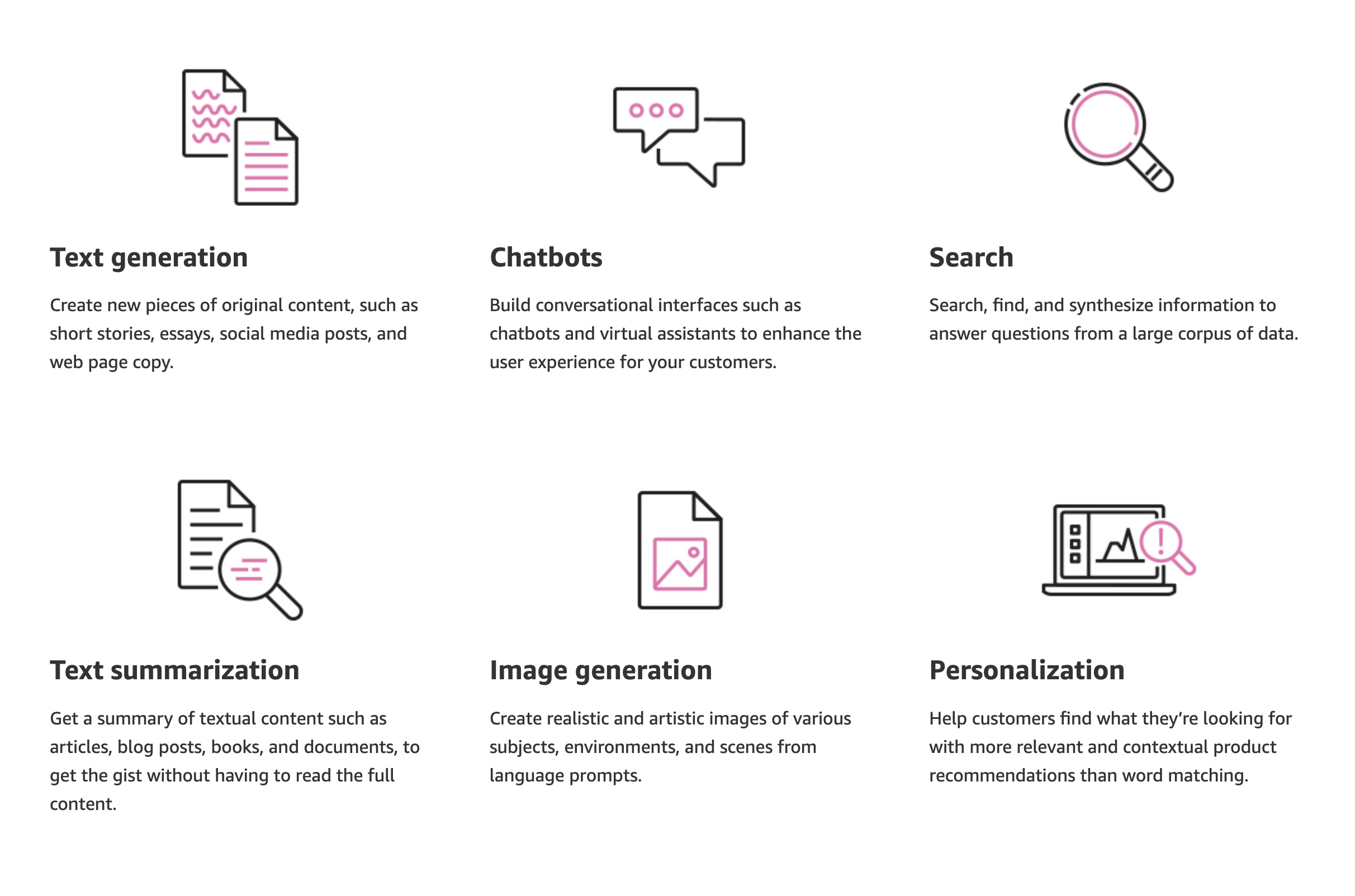 Esto está teniendo lugar mucho más rápido de lo inicialmente esperado: cuando medio mundo está aún sorprendido por las capacidades de los algoritmos generativos de todo tipo – a pesar de que hablamos de productos en un estado todavía muy precario y en beta como para soportar un uso masivo sistemático y verdaderamente fiable, – llega Amazon y lanza un servicio de algoritmos generativos en modo as a Service, llamado Amazon Bedrock: sobre su propia nube AWS y con una oferta de distintos algoritmos para funciones como la generación de texto, de chatbots conversacionales, de búsqueda, de resumen de textos, de generación de imágenes o de personalización de oferta.