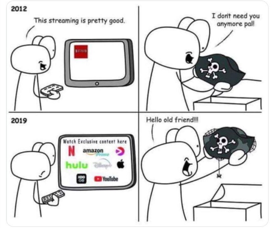 Un recomendable articulo de Mike Masnick, «Piracy is surging again because streaming execs ignored the lessons of the past«, pone de manifiesto el agotamiento del modelo de distribución de contenidos en streaming debido a la proliferación de plataformas que pretenden demandar un pago por suscripción al usuario, algo que ya se había comentado anteriormente en otros artículos, que hemos visto en el caso de numerosos estrenos mal planteados y que hasta el mismísimo Elon Musk ha comentado ocasionalmente.