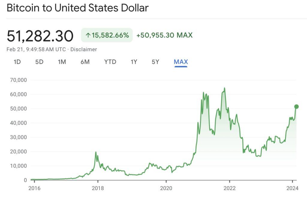 En efecto, el bitcoin, empujado por la oferta de nuevos fondos de inversión como estaba previsto, vuelve a elevar su cotización por encima de los cincuenta mil dólares, y se va acercando a lo que fue su máximo histórico de $64,400 en noviembre de 2021. Ethereum, mientras, alcanza los $2,900, y se acerca a su máximo histórico de $4,644 también en las mismas fechas.