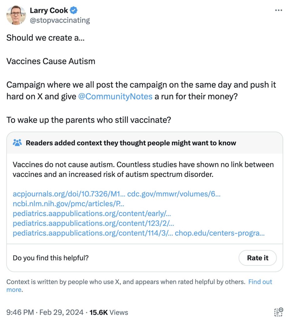 Si fuese otro tipo de noticias, vaya y pase. Pero esta es claramente de un miembro de una Organización Anti-Vacunas. Esto da por tierra el concepto de Elon Musk, de que pagando la suscripción se terminan las Fake News.