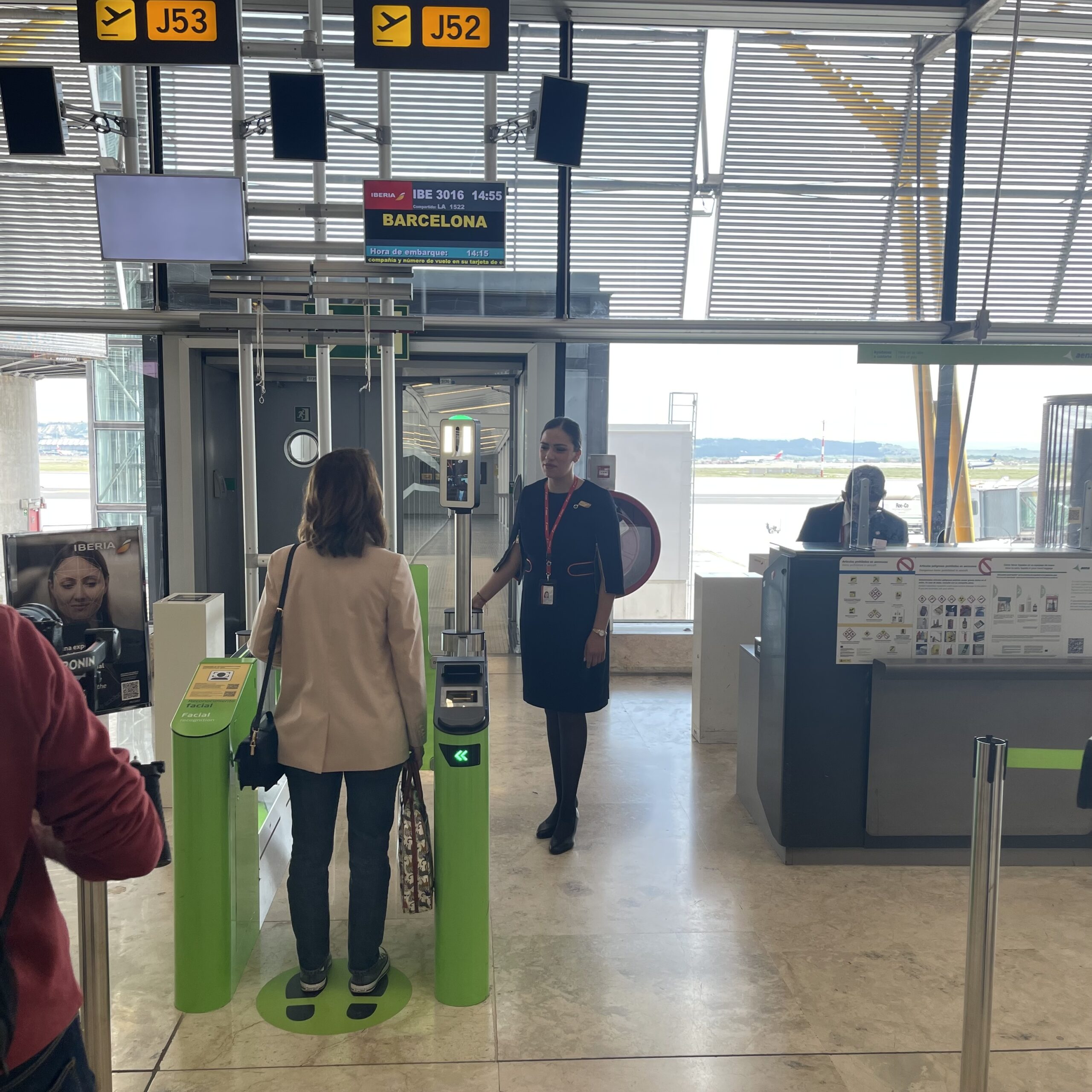 A partir de ahí, el usuario deberá asociar su tarjeta de embarque al acceso biométrico cuando la obtenga en la app, y podrá gracias a ello utilizar unos accesos especiales tanto en el control de seguridad como en la puerta de embarque. Iberia dispone de seis puertas de embarque con reconocimiento facial (J46, J50, J52, J54, J56 y J58), y cuenta con dos quioscos en el área de facturación (Puente Aéreo y Business) y cuatro puertas biométricas en el filtro de seguridad (dos en el acceso principal, una en Puente Aéreo y una en el Fast Track). En el aeropuerto Josep Tarradellas Barcelona-El Prat la aerolínea tiene una puerta de embarque biométrico (A02), dos puertas en el filtro de seguridad y un quiosco en la zona de facturación.