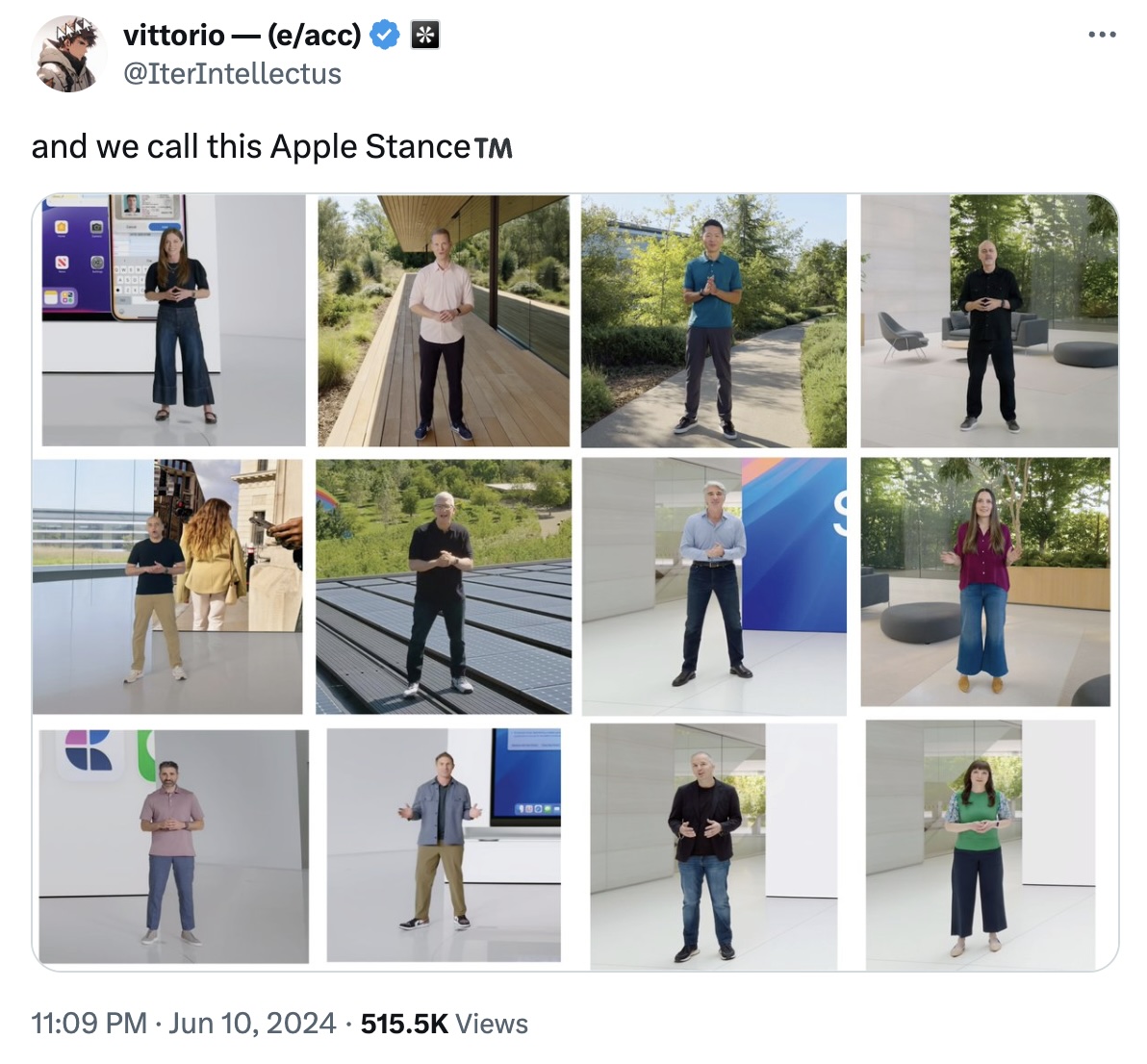 Un usuario de X comparte una imagen recortada de varios momentos de la presentación de Apple en la apertura de su WWDC de este año, en la que doce directivos de la compañía adoptan exactamente la misma postura, un hecho que sin duda llamó a muchos la atención pero que pocos se molestaron posteriormente en recortar y contrastar.