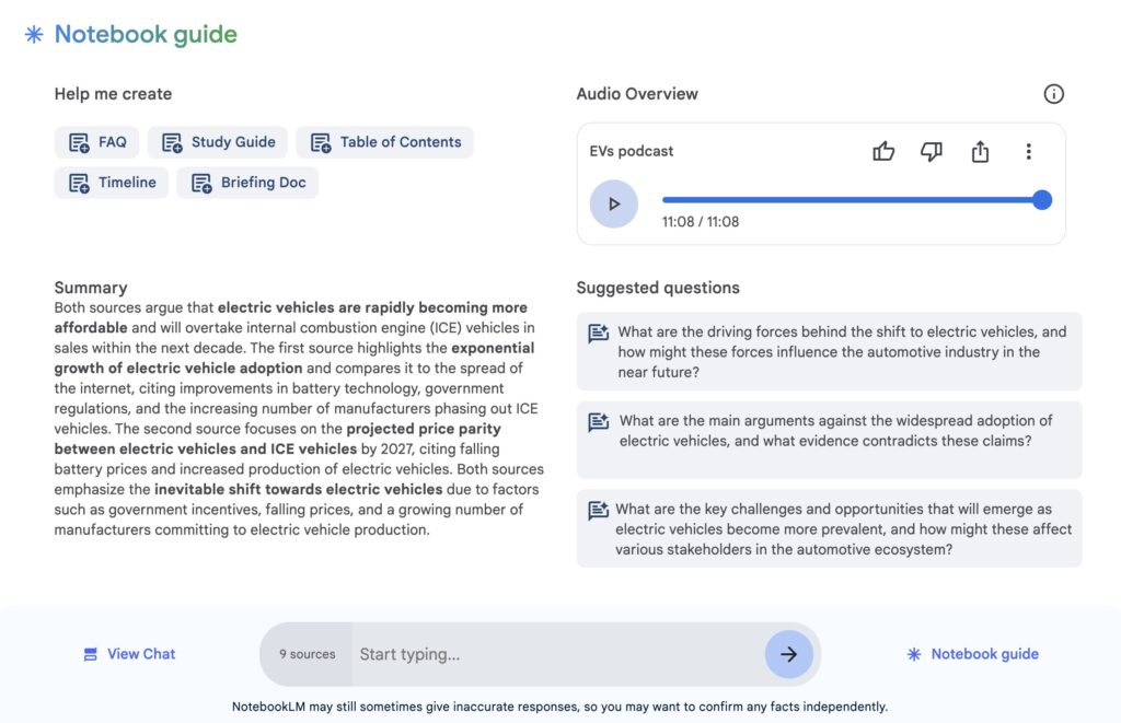 En mi caso, le suministré simplemente nueve artículos míos publicados en Medium sobre la temática del coche eléctrico – los elegí relativamente rápido y sin poner demasiada reflexión en ello – y me encontré, en pocos minutos, con el resultado que podéis ver, o mejor oír, en esa grabación. He probado también con un solo artículo, y es perfectamente capaz de generar algo similar, de unos ocho minutos, e incluso de enriquecerlo con aportaciones de su propia cosecha.