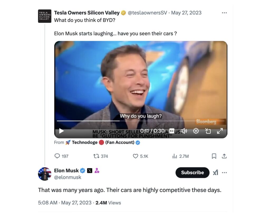 En 2011, Elon Musk se rió en una entrevista de BYD y contestó con un «¿has visto sus coches?». En 2023, se refirió a aquella entrevista como algo que había ocurrido «hace muchos años», y aclaró que ahora «sus coches eran altamente competitivos». Sin embargo, la aproximación al mercado ha sido completamente diferente: mientras Tesla optó por el segmento de lujo y los márgenes elevados, BYD se dirigió al segmento bajo y a las ventas masivas: su Seagull está en torno a los diez mil dólares con 560 km de autonomía, y en España tienen una cartera de modelos con siete eléctricos puros que cubren toda la gama y únicamente un híbrido enchufable. Mientras Tesla competía exitosamente con BMW, Mercedes y similares, BYD competía con Toyota. Eso ha obligado a los Estados Unidos y a Europa a proteger a su escasamente competitiva industria local con aranceles de hasta el 100%, retrasando así irresponsablemente la transición a la descarbonización del transporte.