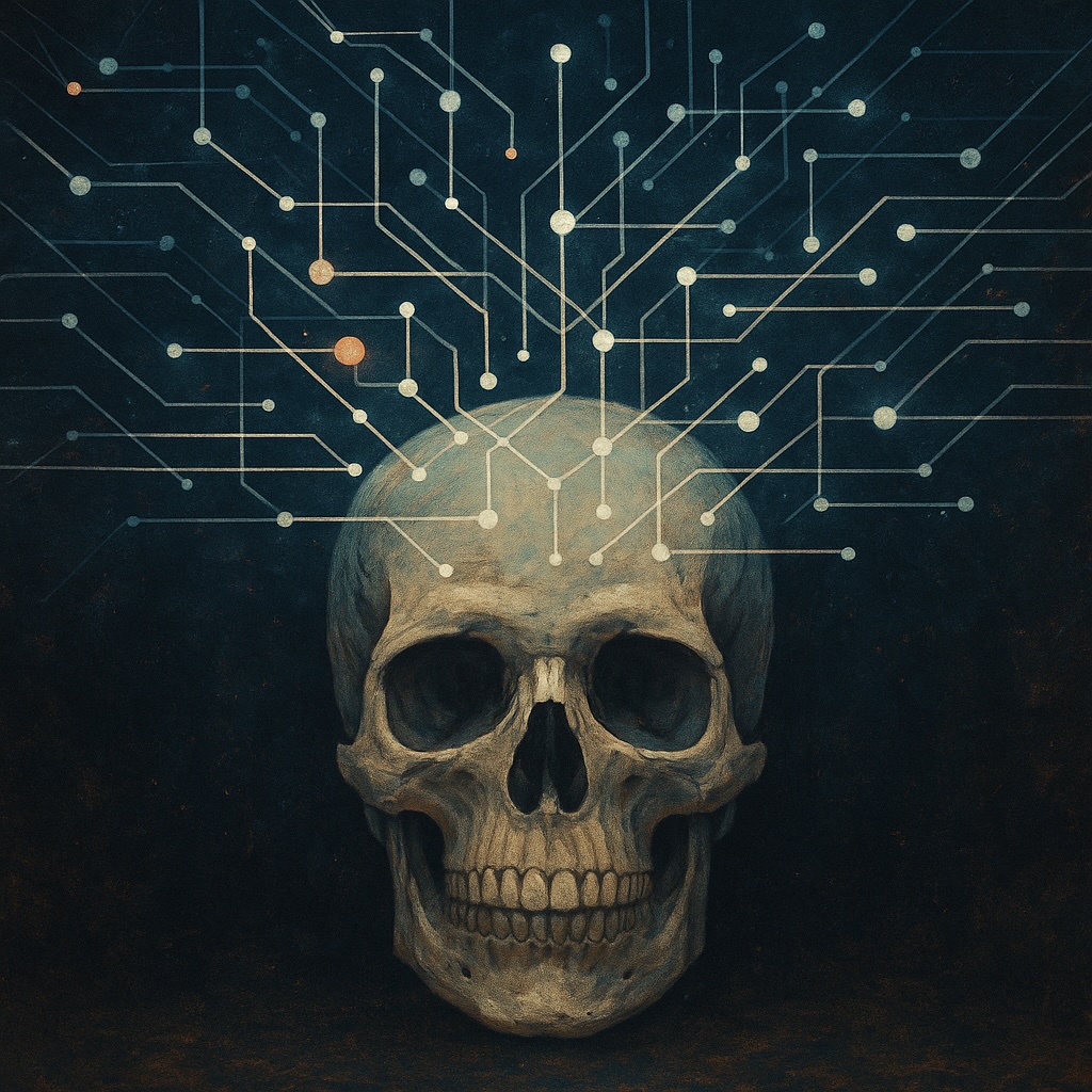 IMAGE: A human skull rests in the center of the image, with glowing digital circuit lines branching out from its top, symbolizing the death of the old web and the rise of artificial intelligence
