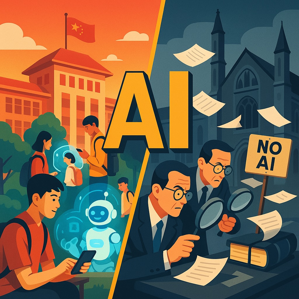 IMAGE: A split‑screen square illustration. Left side: a modern Chinese university campus bathed in warm orange tones, students chatting with friendly holographic AI assistants. Right side: a gloomy Western campus in muted blues and greys; stern professors inspect papers with magnifying glasses under a “NO AI” placard, loose pages swirling in the air. A bold yellow “AI” bridges both halves