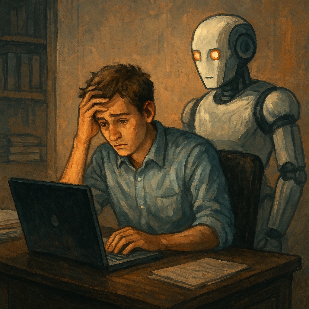 IMAGE: A digital illustration shows a young man at a desk, looking worried while working on his laptop, as a humanoid robot with glowing eyes looms behind him, symbolizing AI overshadowing entry-level workers