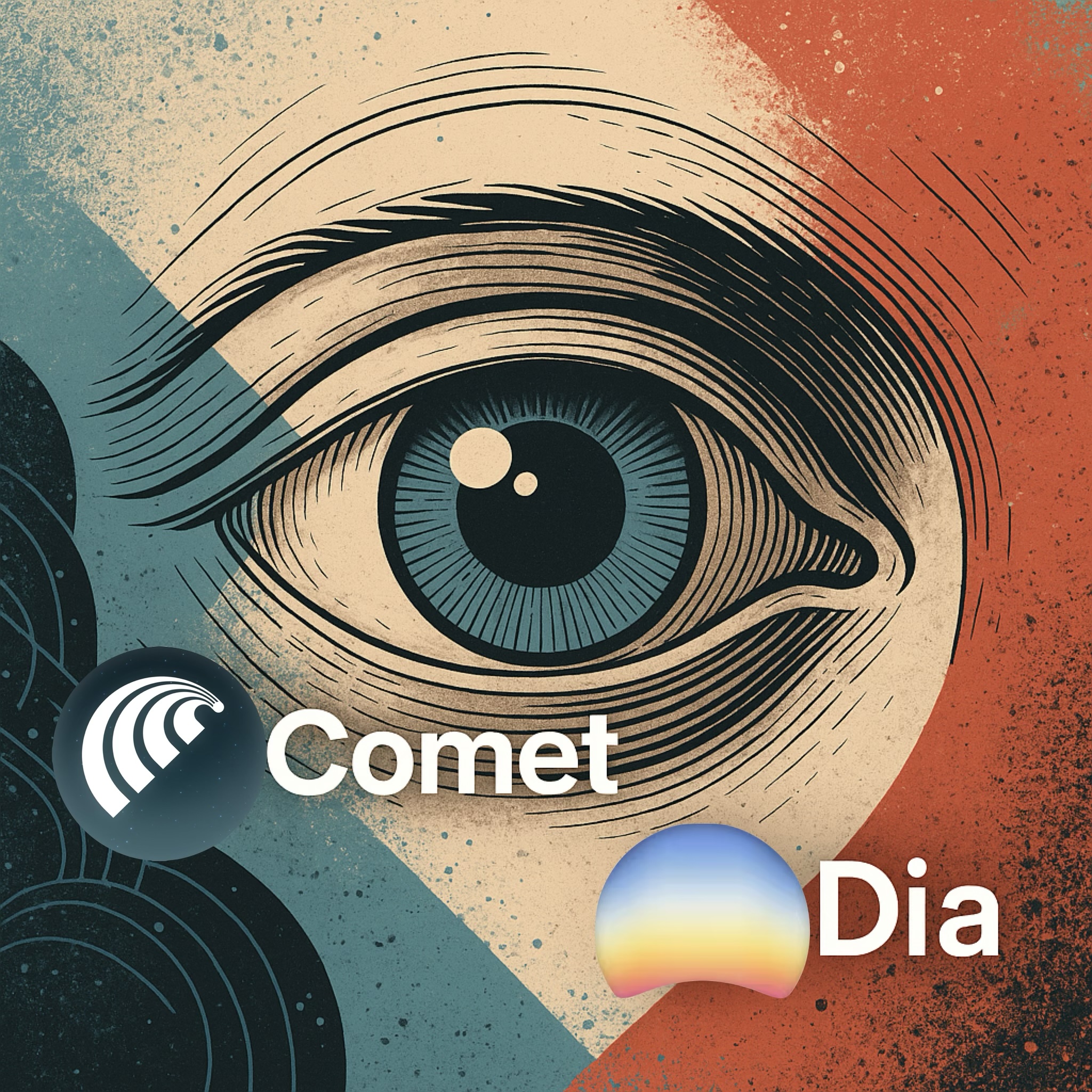 IMAGE: A square digital illustration showing a large stylized eye at the center, symbolizing observation and context. The Comet and Dia logos are placed prominently near the eye, with abstract blue, red, and beige textures suggesting a futuristic, AI-enhanced browser environment