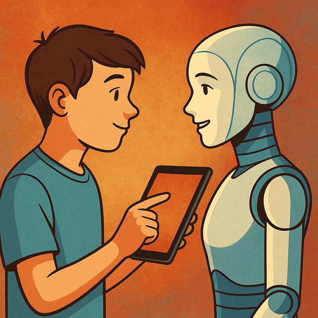 IMAGE: A teenage boy holding a tablet while looking at a humanoid robot, symbolizing AI as a study companion