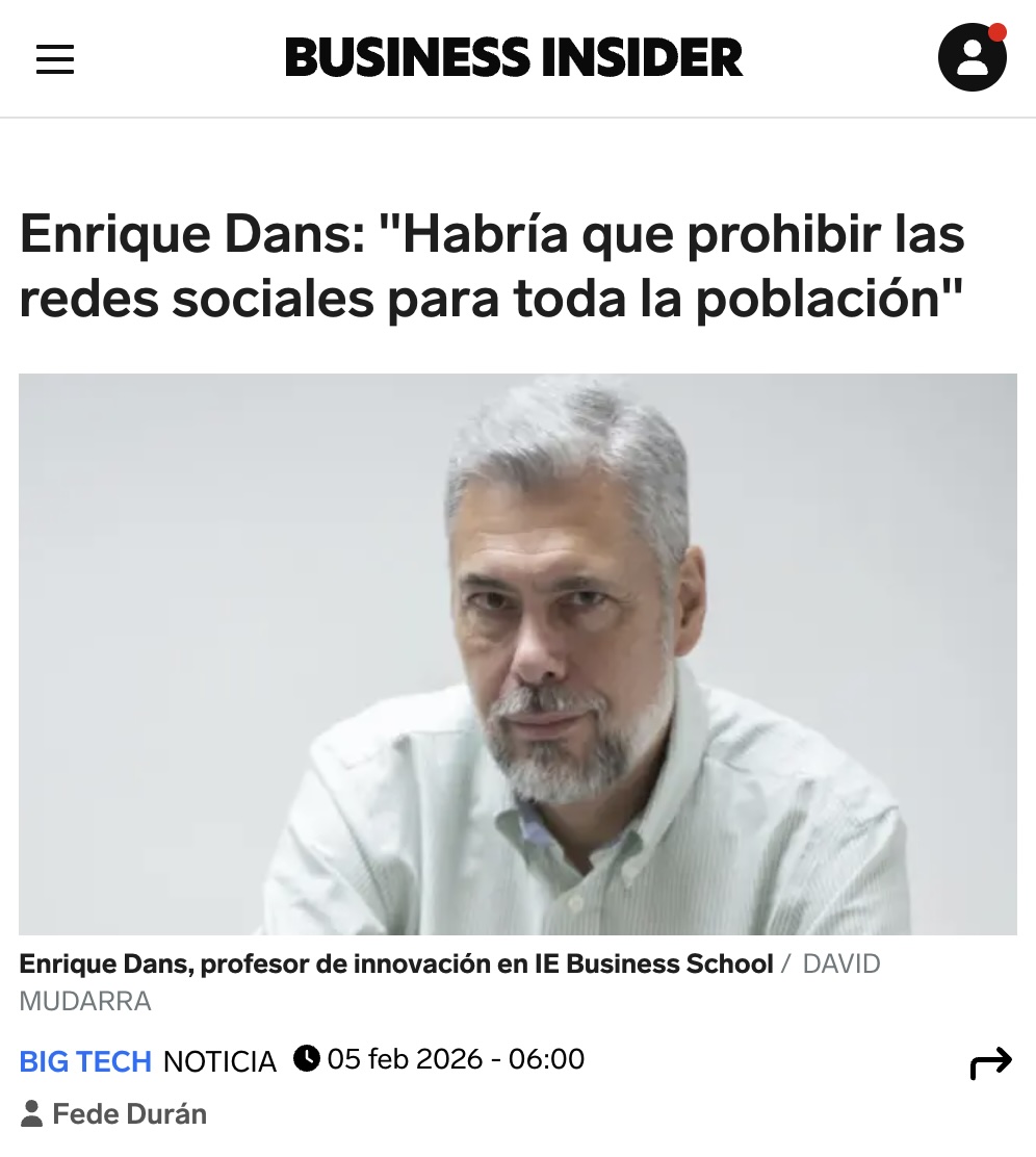 Fede Durán me entrevistó para Business Insider, y aunque el artículo habla de más cosas, dada la relevancia mediática del tema, lo ha titulado como «Habría que prohibir las redes sociales para toda la población» (pdf).