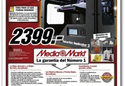 El folleto de MediaMarkt de la semana pasada (pdf), el que se distribuye en domicilios particulares y centros comerciales, traía una interesante novedad: su contraportada, un lugar claramente destacado, estaba dedicada a la MakerBot Replicator 2, una de las impresoras 3D más