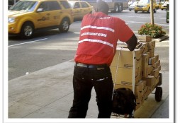 La fotografía está tomada en la calle en Nueva York, hace pocos días: un repartidor de paquetes de un operador logístico, empujando un carrito en el que todos los paquetes llevan la característica sonrisa de Amazon.