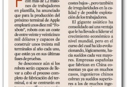 Mi columna de Expansión de esta semana, titulada «Ya están aquí» (pdf), utiliza la noticia de la implantación de robótica en la cadena de ensamblaje de Foxconn de cara a la fabricación del próximo iPhone 6 para especular sobre la importancia de un cambio radical en la forma de